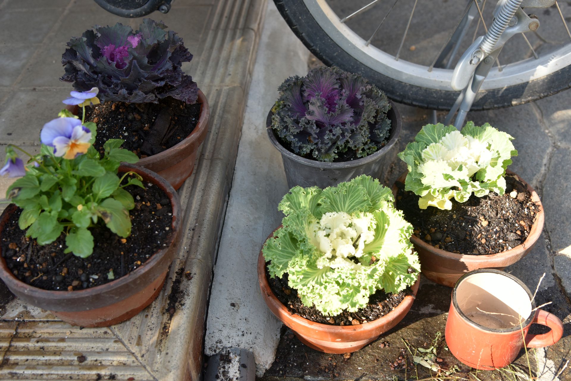 冬の観葉ヘデラとサボテン葉牡丹、パンジー湿気と日照時間の低下でサボテンと多肉がいくつか☆になってしまい泣く泣く強めのヘデラを購入冬の観葉といえば、ということでハボタンを ヘデラとサボテンは室内栽培で十分ですがパンジー、ハボタンは冒険の意味もあります。室内栽培、窓の所に吊るしておきますパンジーは家族の中で好きなのが私だけで、あまり興味がないとのことなので、日当たりの良い南向きの窓際に配置なんとかなればいいなあ