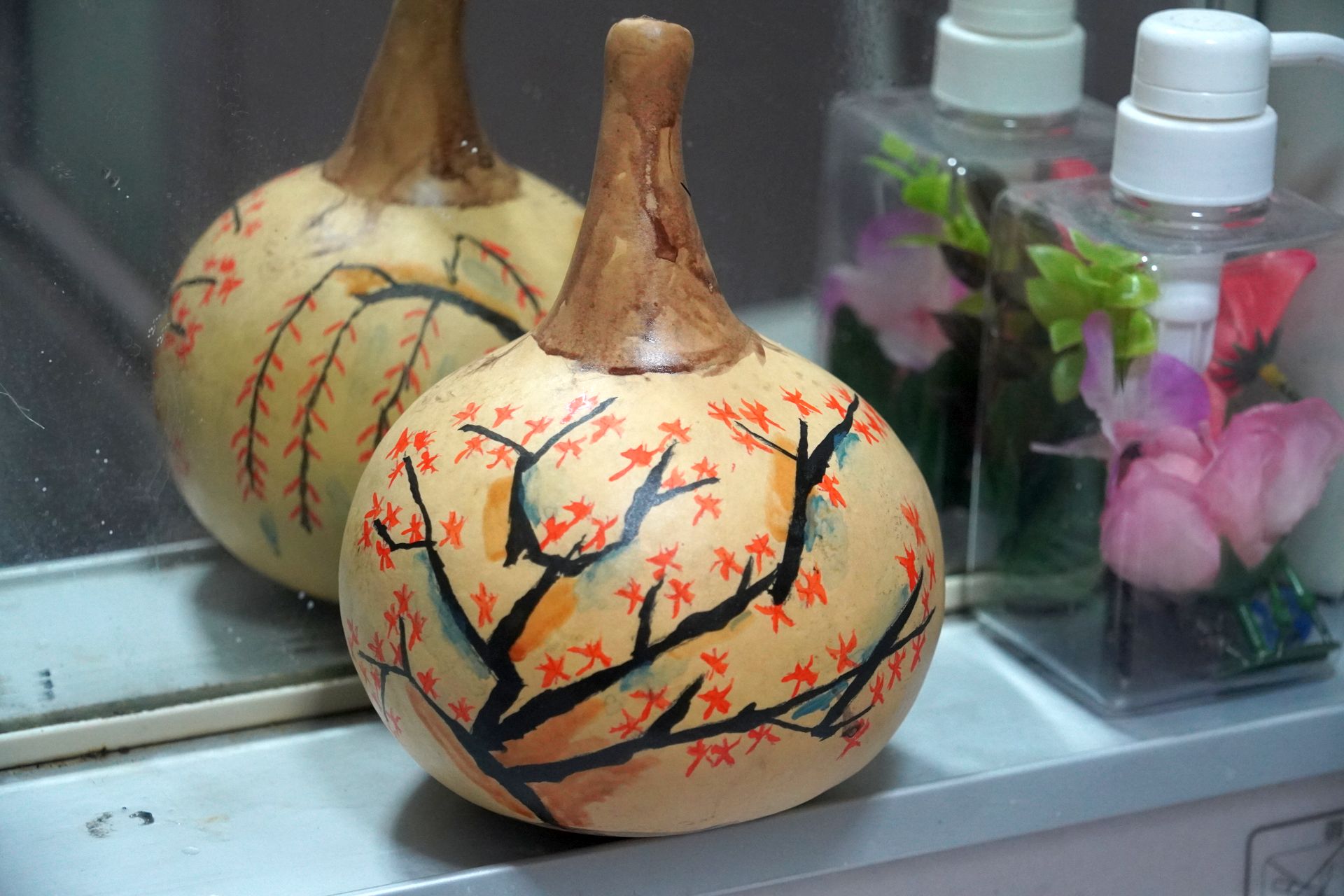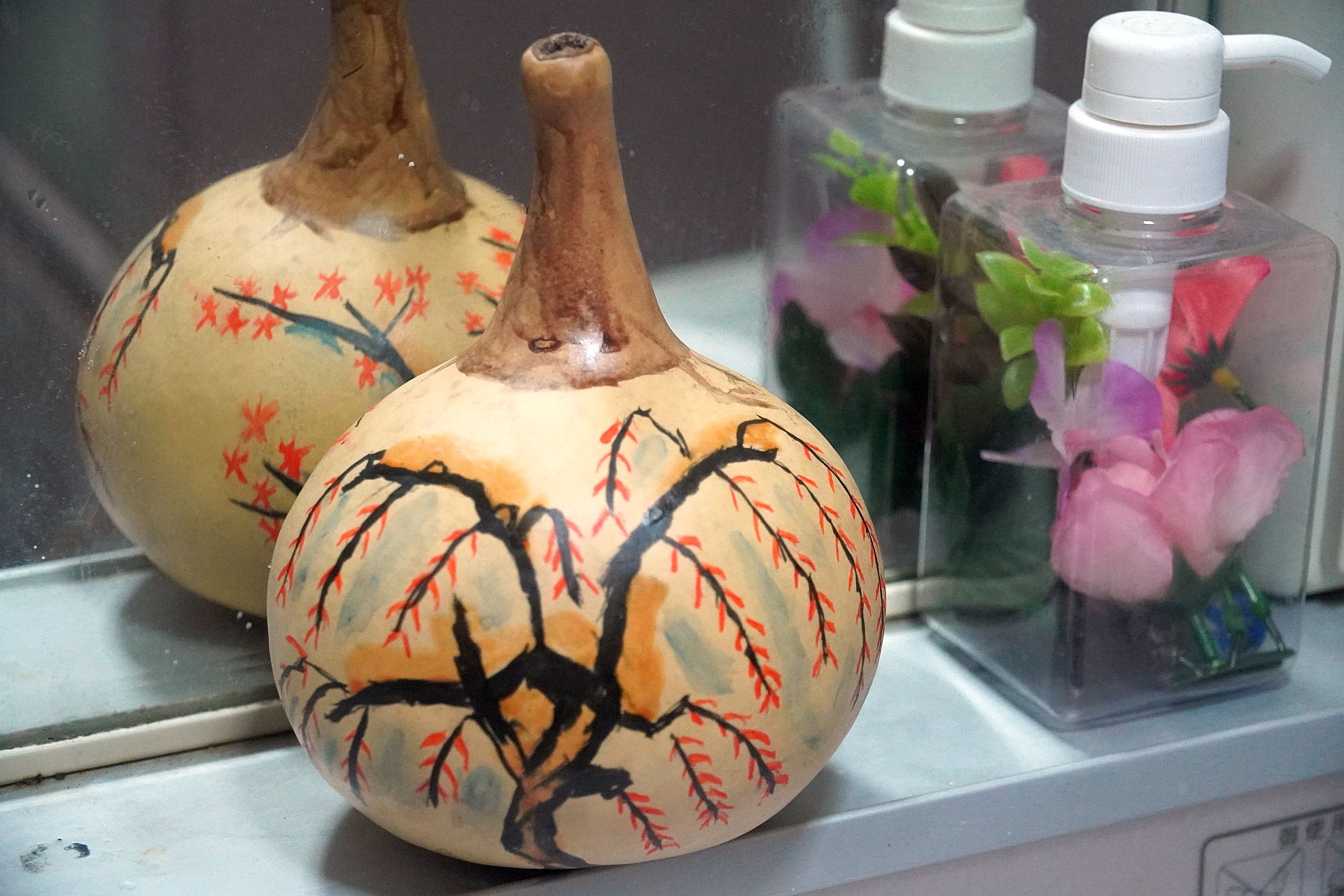 瓢箪に絵を描く1前回のこの記事で大体感じをつかんだので、民芸品調を目指して絵をかいてみましたメインの絵は基本墨汁と朱色のみで仕上げ、華やかさを演出するのに水彩絵の具を若干使用しています瓢箪を彩色する今回は梅と藤をイメージしています 梅藤木に塗る用のニスを茶色の着色に使用すると非常にいい感じになります赤と黒だけでは色が寂しいかと思い少し色を追加しましたが、正解でした。