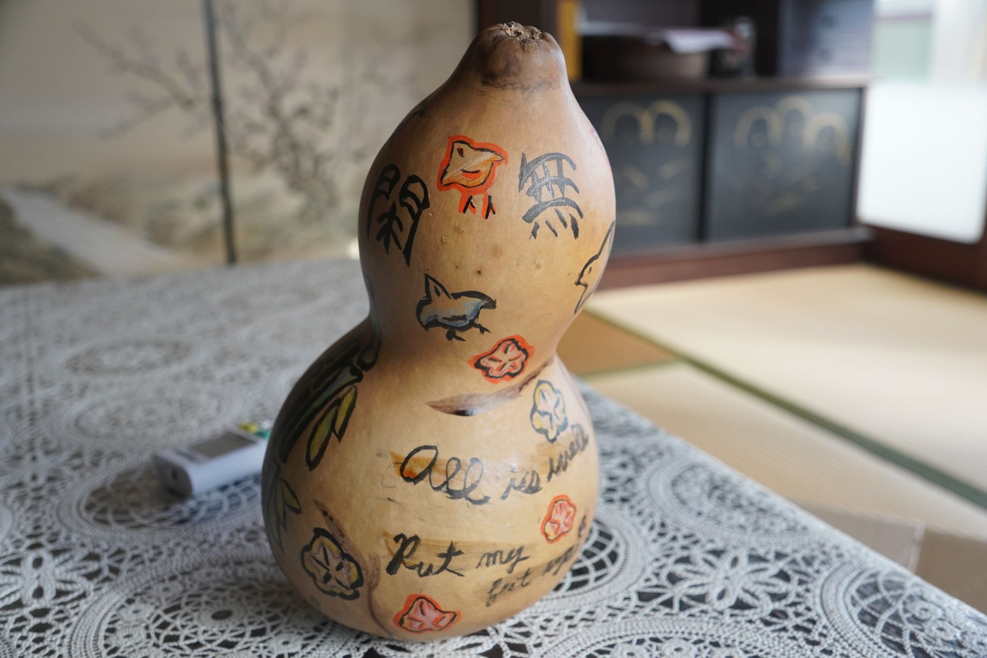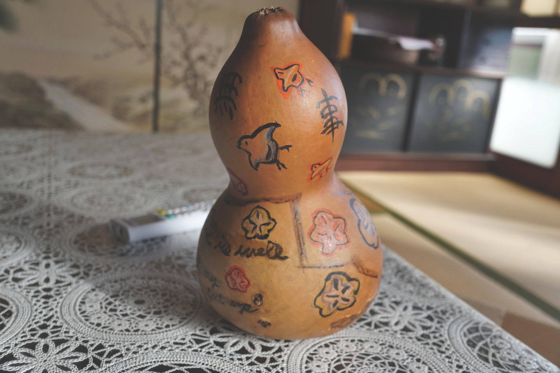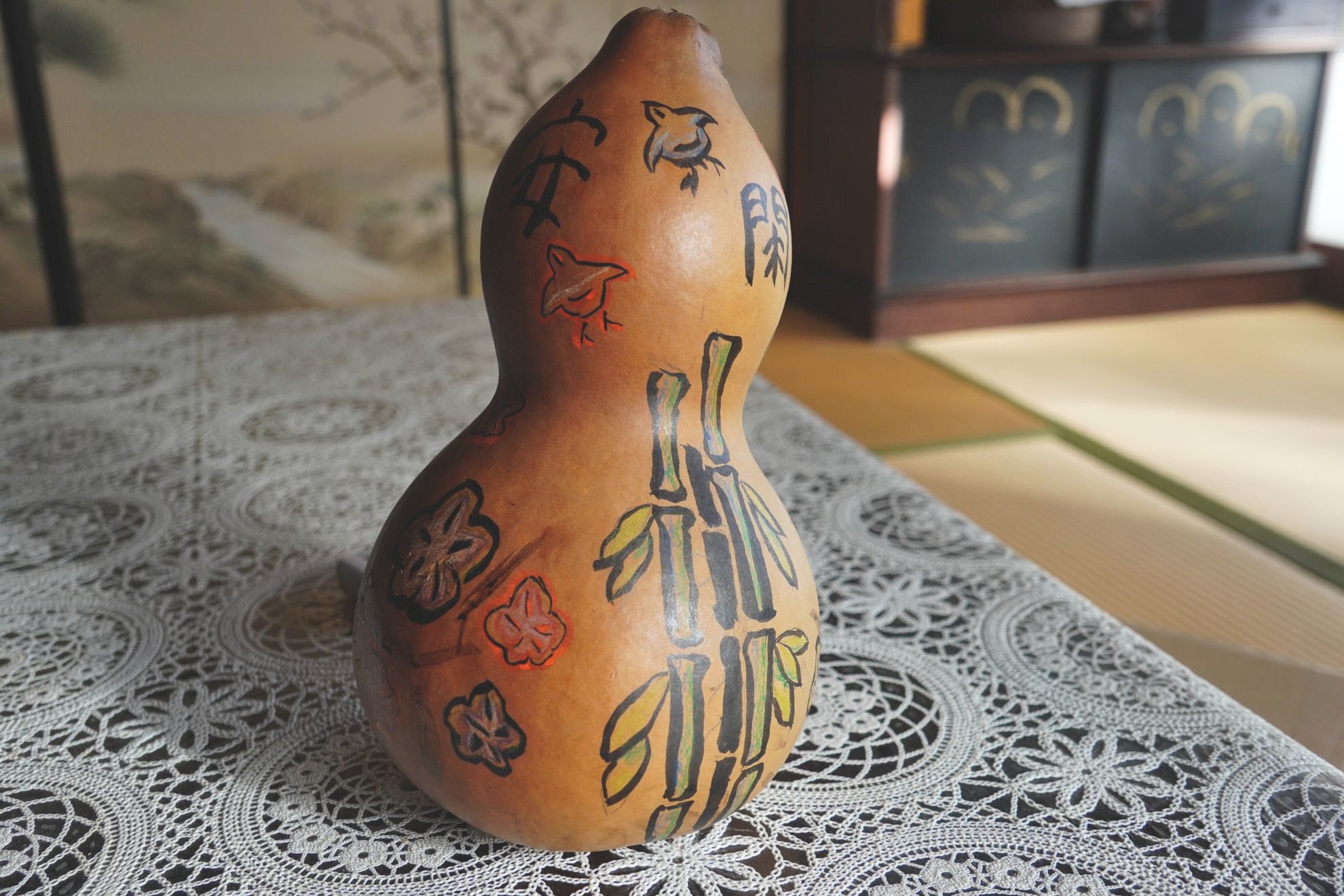 色付けに色鉛筆を使用、水彩絵の具は水で薄めると瓢箪が水をはじくため、色を淡く載せるのがなかなかむつかしいので色鉛筆に。
