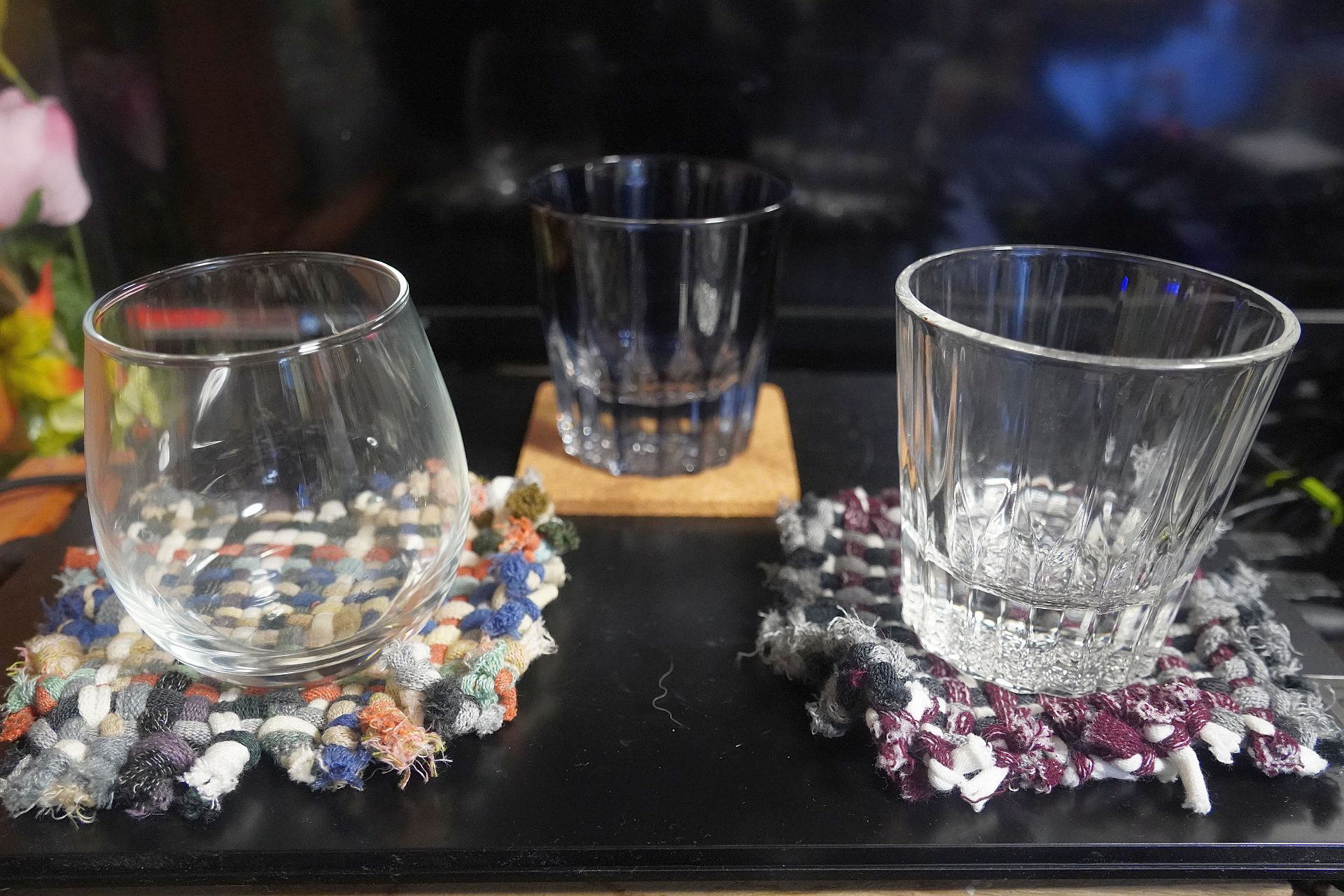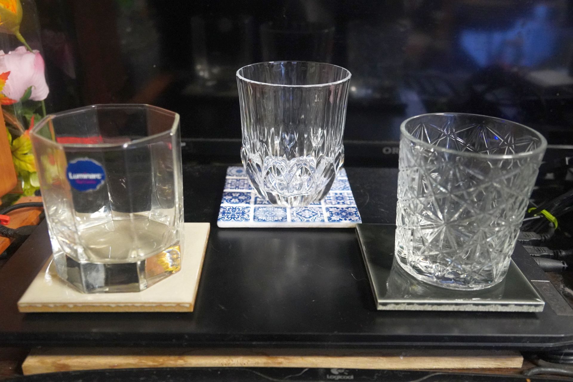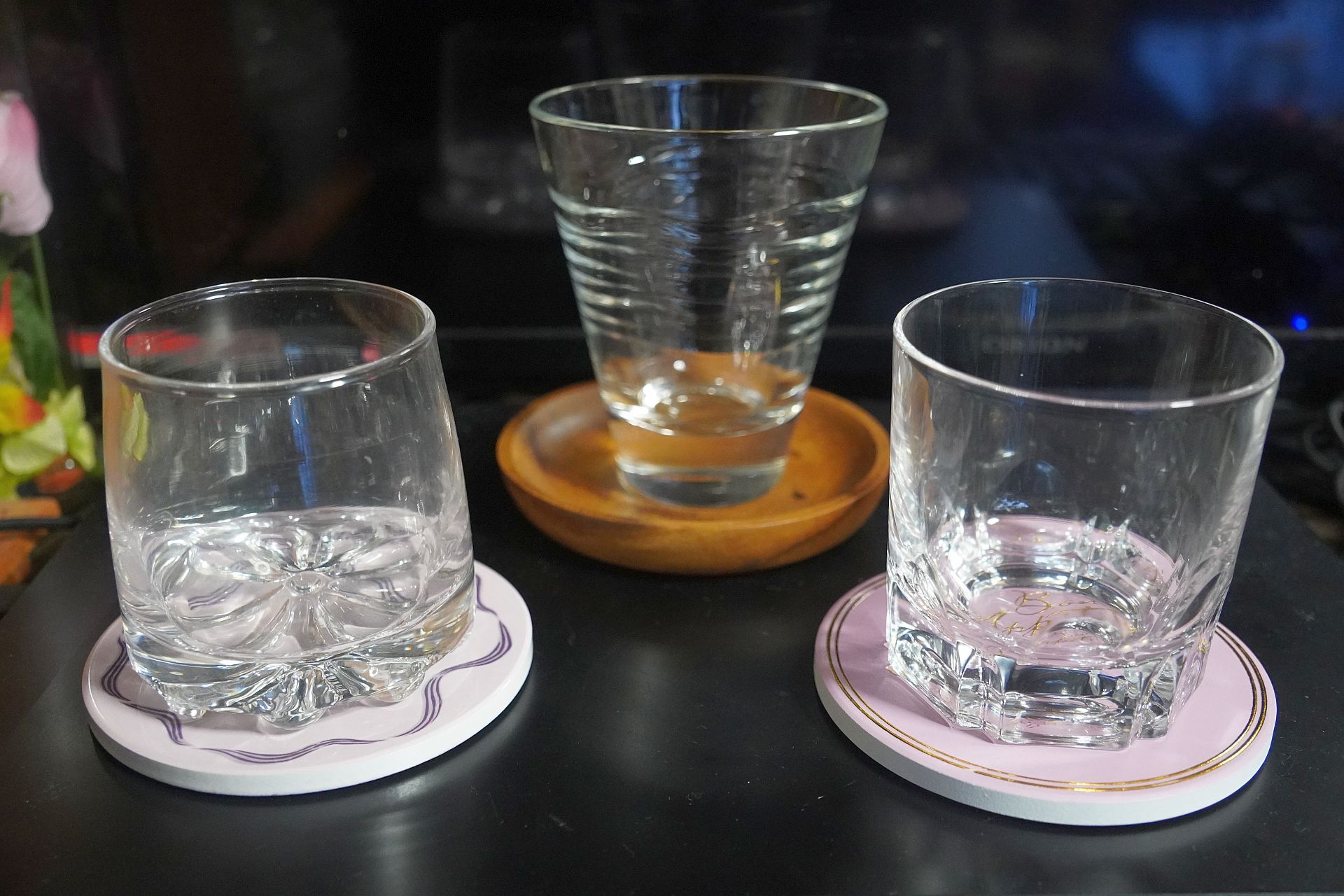 一番左のものは無印良品の耐熱グラスですが、それ以外のものはネット通販で見かけた、どうやらバー等の業務用のグラスを扱っている店で見つけたものです。高級なものではないですが、値段考えたらそれなりかなと思い、デザインかぶりを極力避けて集めてみました。