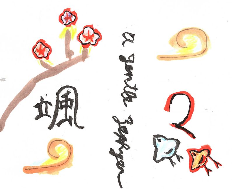 竹と梅と千鳥梅に鶯にすればよかったと書き上げてから気づきましたがまあ私は気に入っているのでそれはまた今度。筆記体の最期のほうのeが一個多いような気がしますがご愛嬌ということで颯々・・・風がさわやかに拭きすぎていく音a gentle zephyr(穏やかな微風)