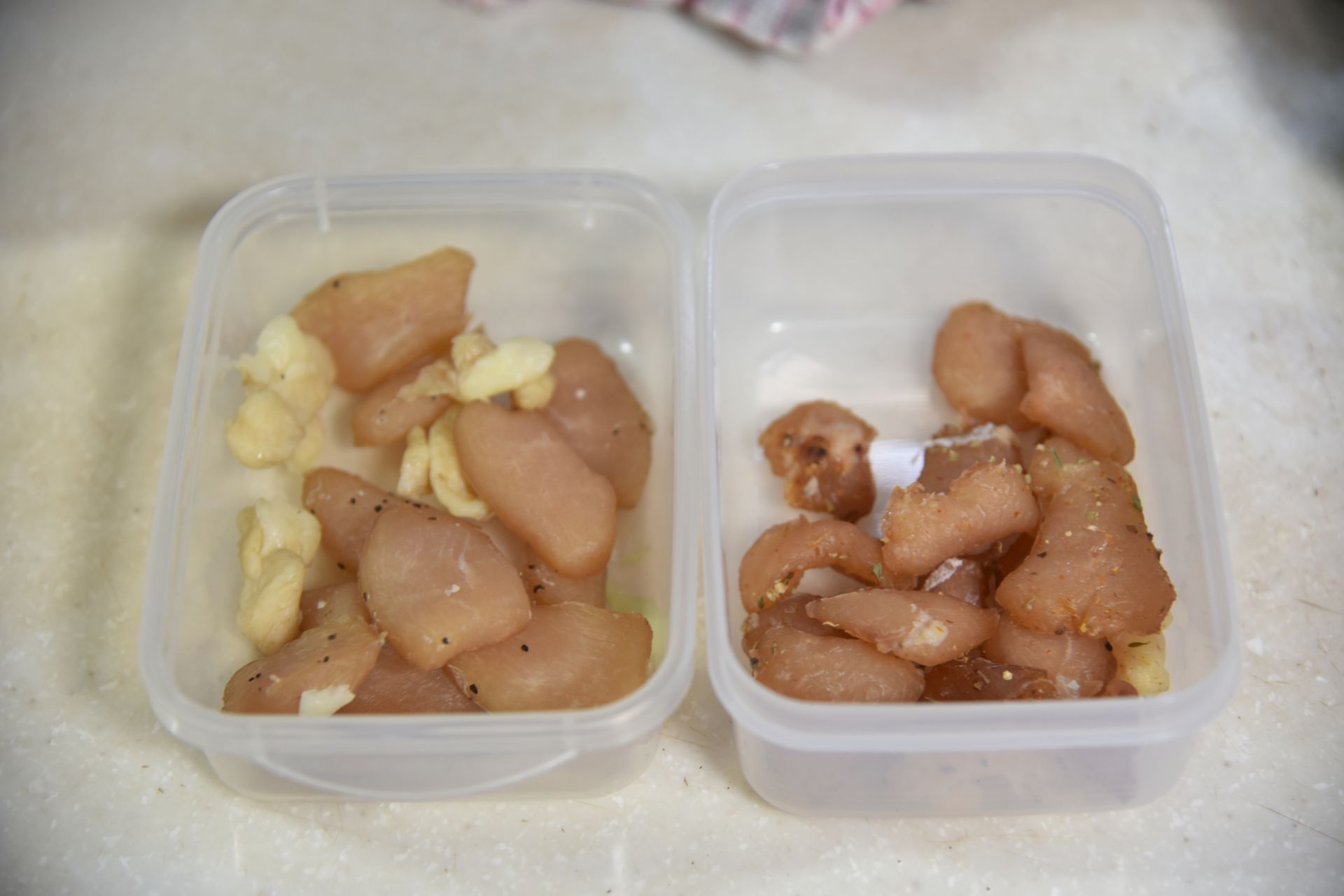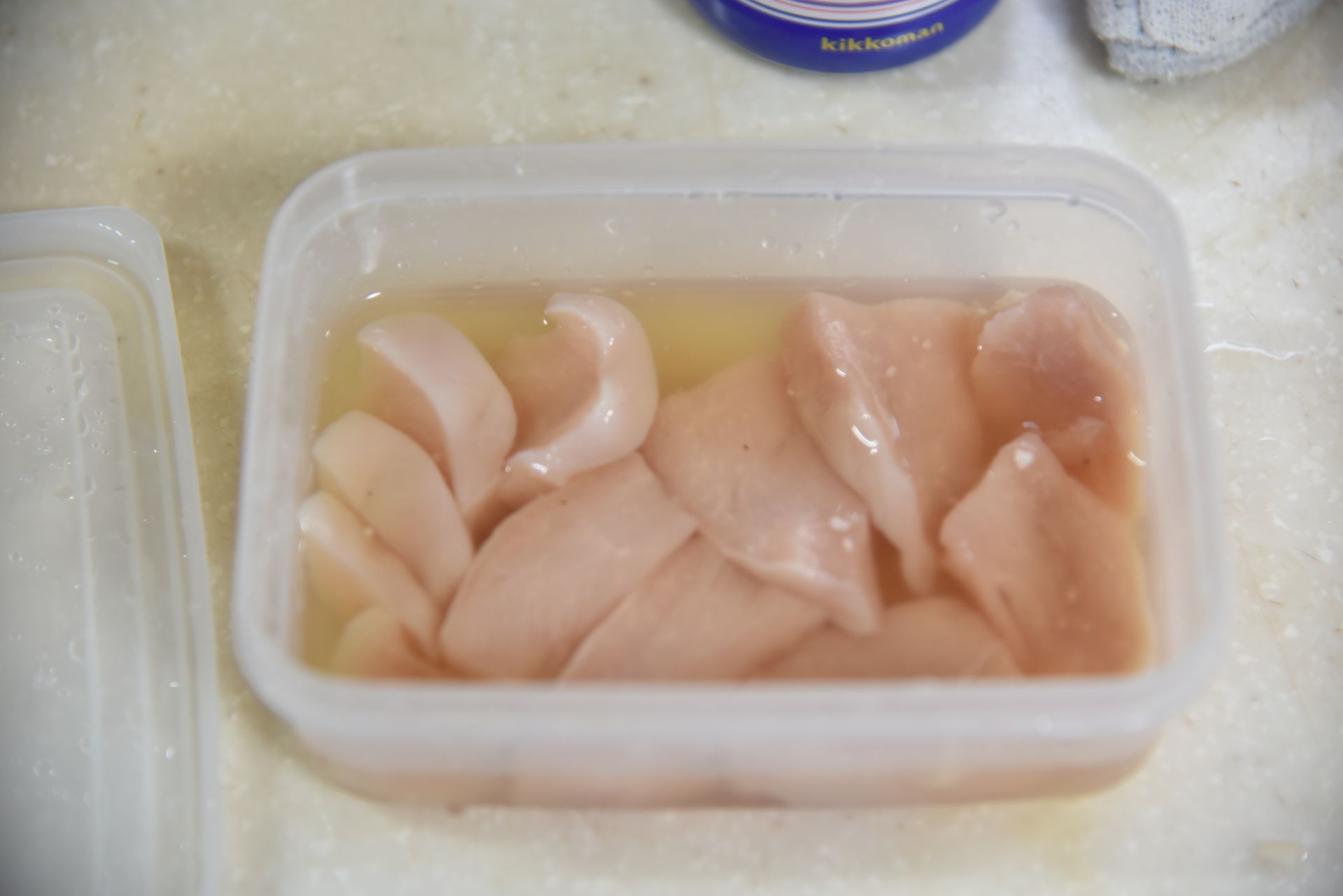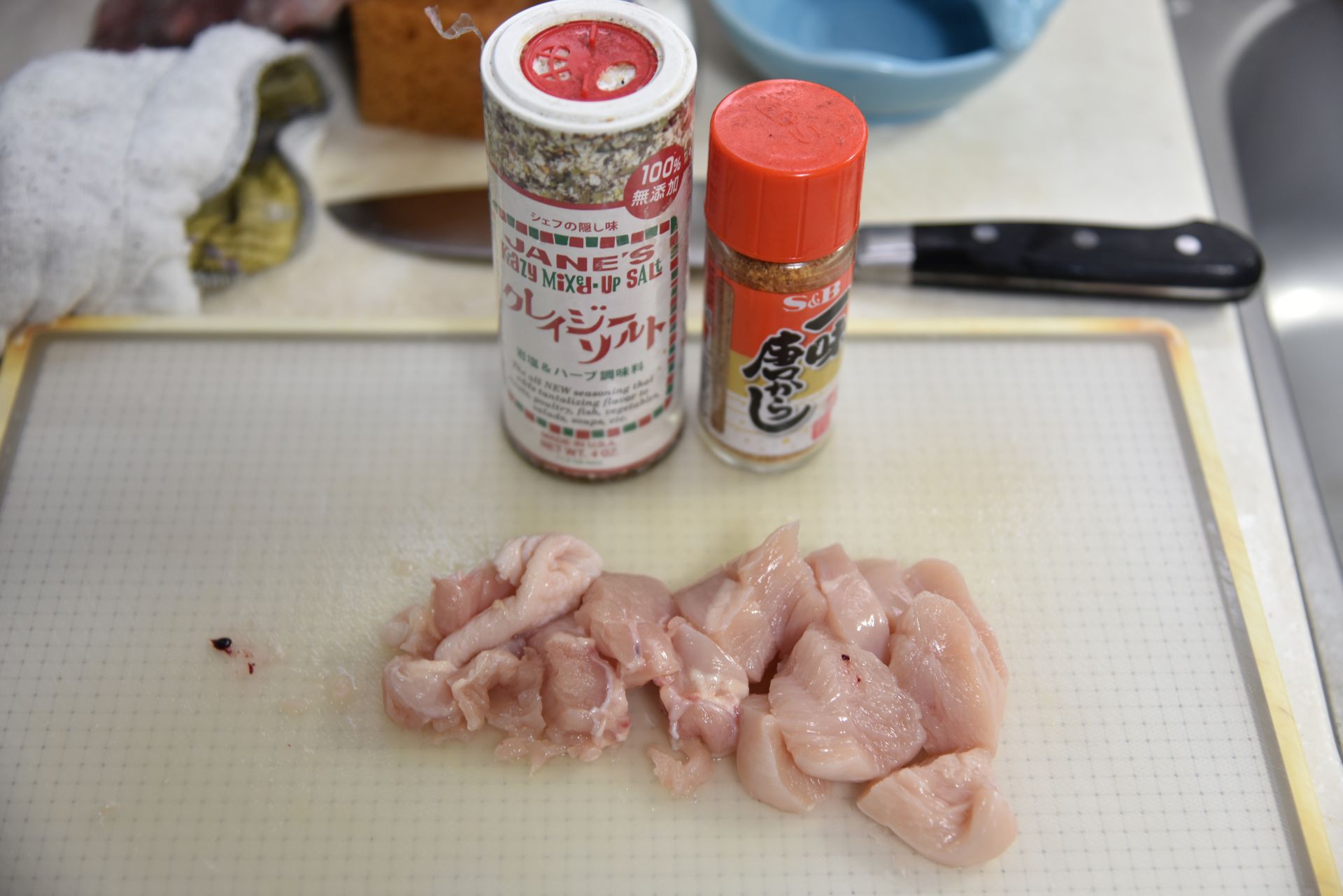 鶏むね肉を一口サイズに切って、調味液につける、味付けをして一晩。鳥皮が好きなので今後鳥皮がおいしかったら鳥皮だけかうのも考えたいです