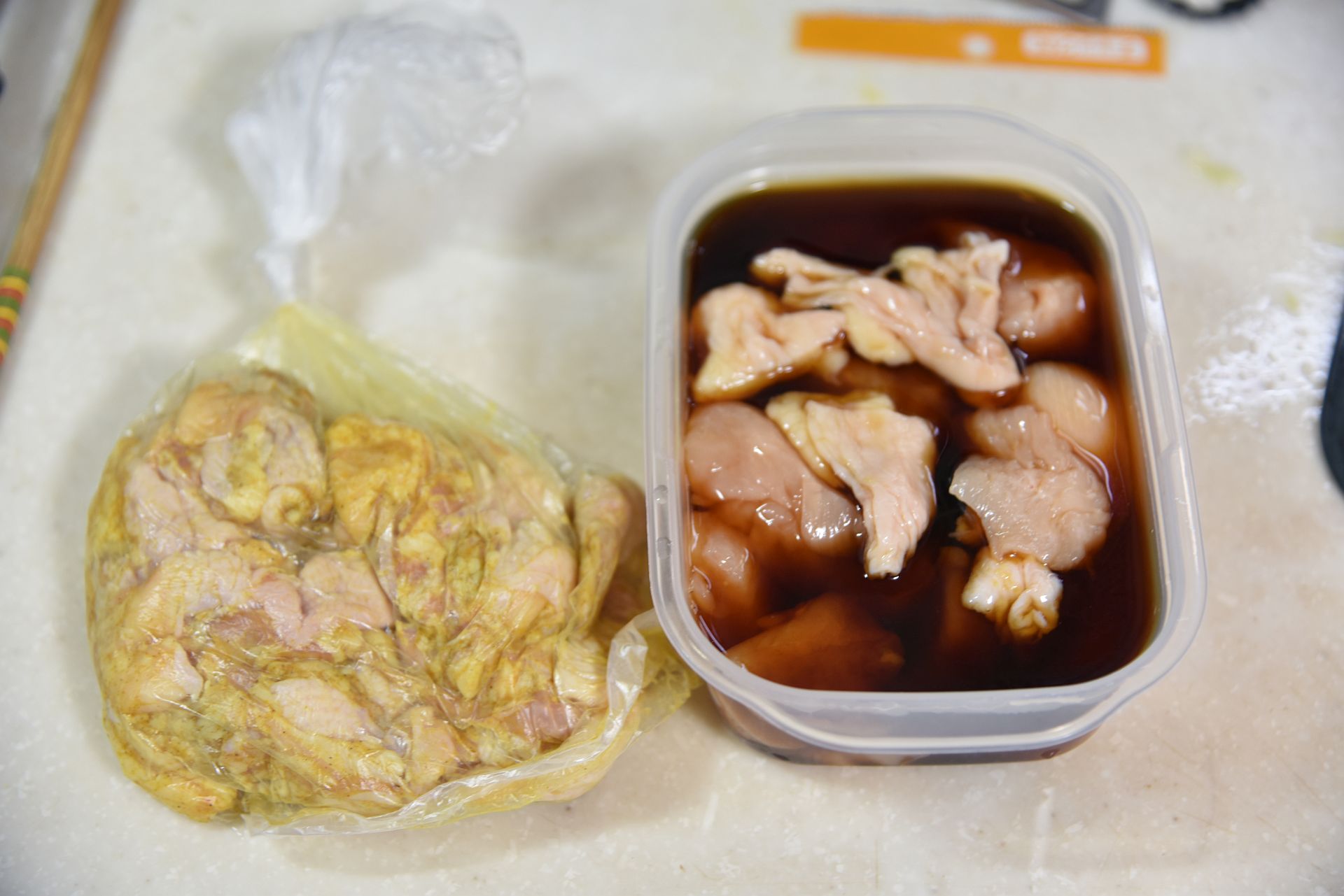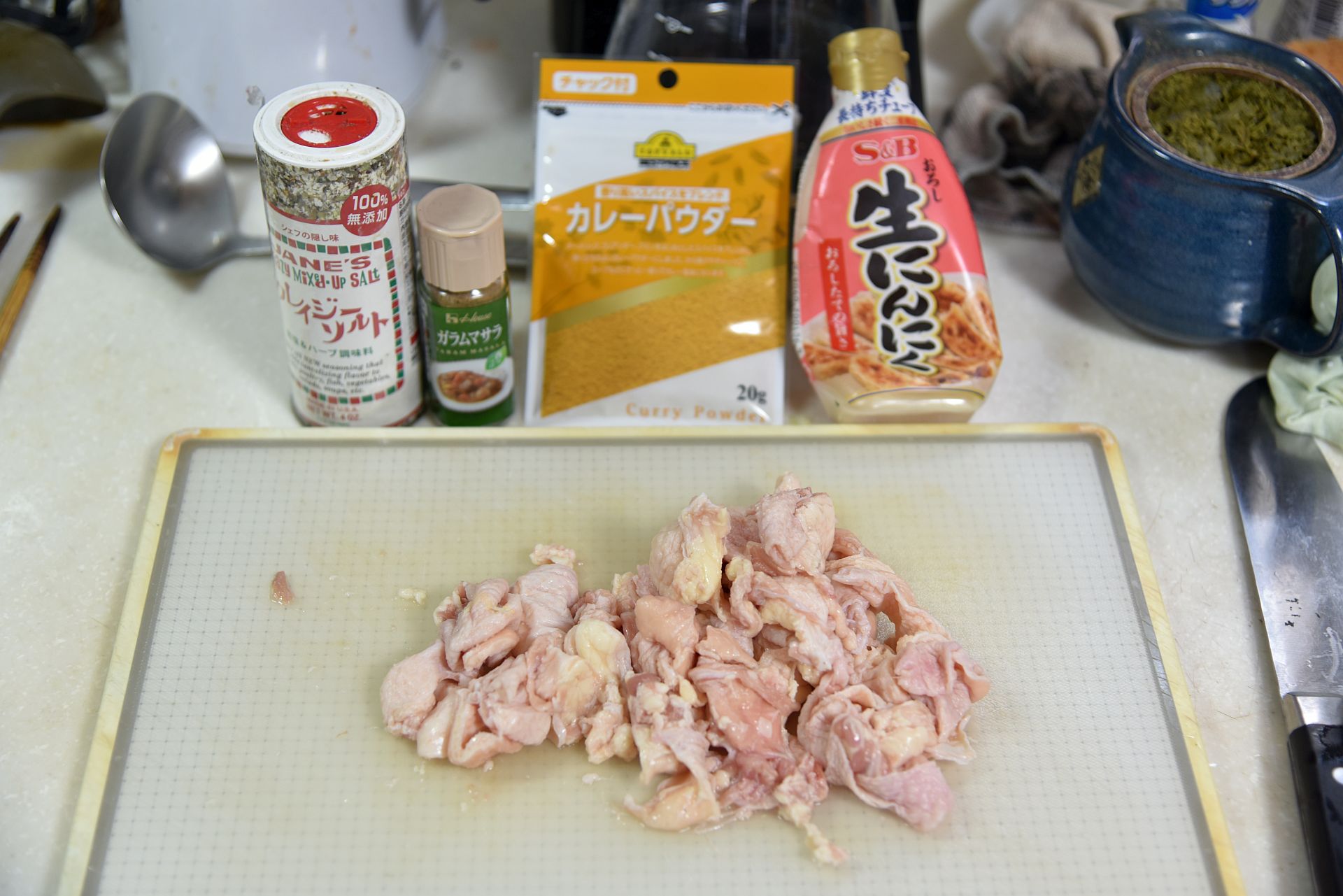 むね肉をしょうゆダレにつけ、鳥皮をカレー粉で味付けしてみます