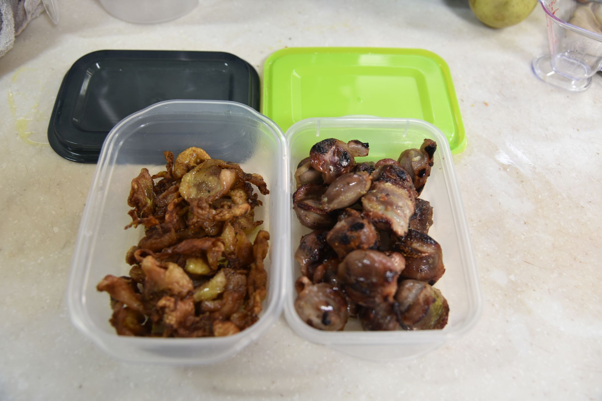 最初に鳥皮を強火で軽く炒め、脂が出始めたら弱火にして蓋をして五分。鳥皮の油を適量残し、砂肝を強火で軽く炒め、弱火にして蓋、同じく五分で出来上がり